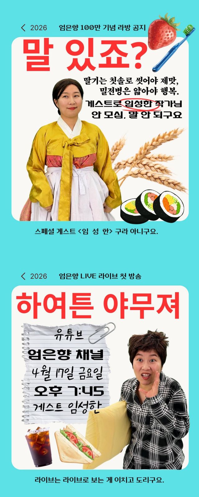 현재 퇴원해 17일 첫 라이브 진행을 앞둔 엄은향은 "임성한 작가님을 모실 예정이라지!!! 100만 구독 기념 어쩌고 때문에 허언 공지 아니냐고. 근데 놀랍게도 진실이라지!"라며 실제 임 작가와의 합동 라이브임을 강조했다.