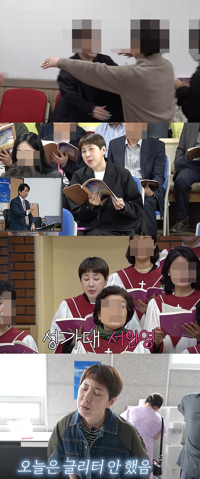 이날 그는 교회에 도착하자마자 찬양대 연습실로 향해 교인들과 반갑게 인사를 나눴다. 자연스럽게 어울리며 친분을 드러냈지만, 연습 과정에서는 박자를 놓치거나 다른 파트에 들어가는 등 쉽지 않은 모습을 보이기도 했다.