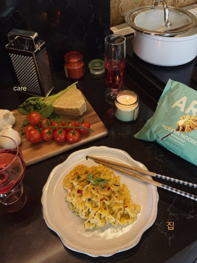 먼저 모던 누들(Modern Noodle). 일반적인 라면과 구별되는 신개념 누들로 액상 스프 기반의 소스가 면에 깊게 스며들며, 페투치니 스타일의 면발로 파스타에 가까운 식감을 구현했습니다. 고추장버터, 간장버터, 봉골레, 트러플 불고기 등 K-푸드와 글로벌 레시피를 조합한 7가지 맛으로 구성되어 있죠. 간편식의 범주를 넘어서, ‘집에서 즐기는 레스토랑 경험’을 선사합니다.