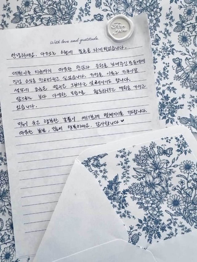 결혼 이후에도 배우로서 활동을 이어간다고 했다. 편지 끝에는 팬들을 향해 많이 웃고 행복한 날들이 펼쳐지길 바란다고 적었다. 결혼 소식을 전하면서도 팬들 걱정을 먼저 챙긴 문장이었다.