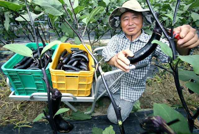 경남 산청군 산청읍 묵곡마을에서 한 농민이 탐스럽게 열린 보랏빛 가지를 수확하고 있다. / 뉴스1