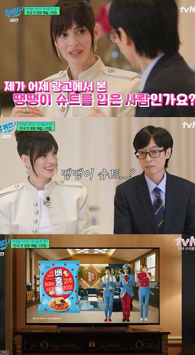 앤 해서웨이가 ‘유퀴즈’에 출연해 유재석을 향한 뜻밖의 질문으로 웃음을 안겼다.
