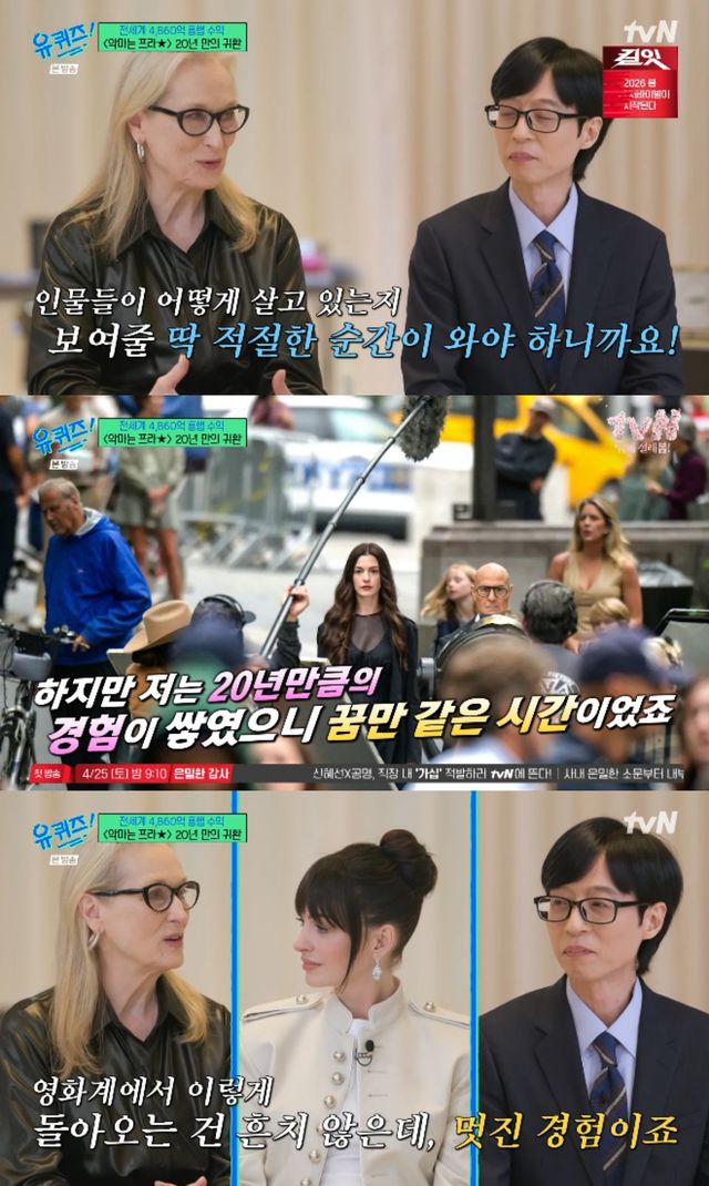 15일 방송된 tvN 예능 프로그램 '유 퀴즈 온 더 블럭'에서는 영화 '악마는 프라다를 입는다2'로 20년만에 돌아온 할리우드 배우 메릴 스트립, 앤 해서웨이가 출연해 이야기를 나눴다.