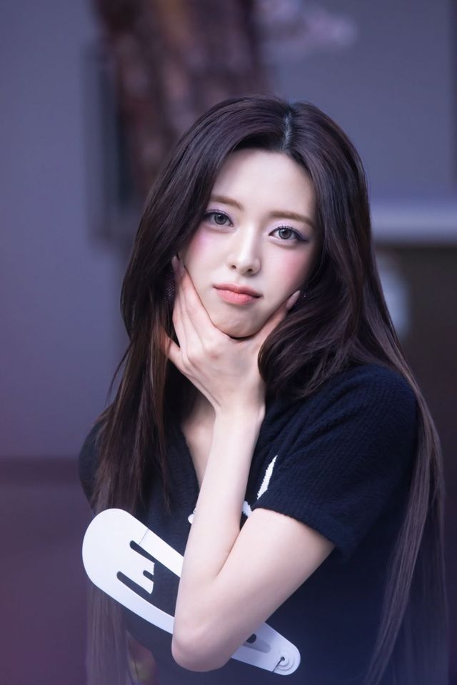 뷰티 스타일링은 유나의 선명한 이목구비를 강조합니다. 어깨를 감싸며 길게 내려오는 다크 브라운 롱 스트레이트 헤어는 찰랑이는 질감을 통해 청순하면서도 시크한 분위기를 완성하며, 메이크업은 눈두덩이에 넓게 펴 바른 연보라색(라벤더) 아이섀도우와 핑크빛 치크를 통해 신비롭고 몽환적인 비주얼을 완성했습니다. 촉촉한 피치 립은 그녀의 생기 넘치는 미소를 뒷받침합니다.