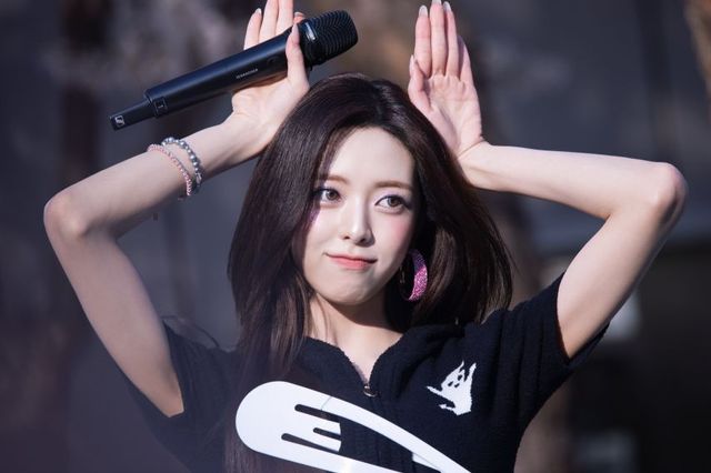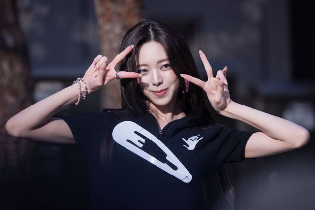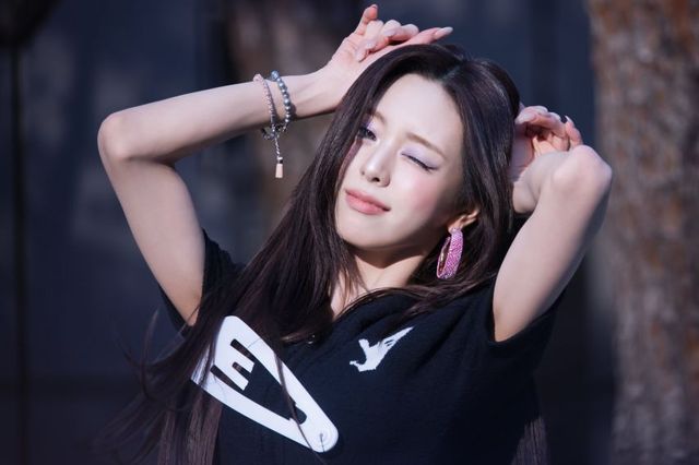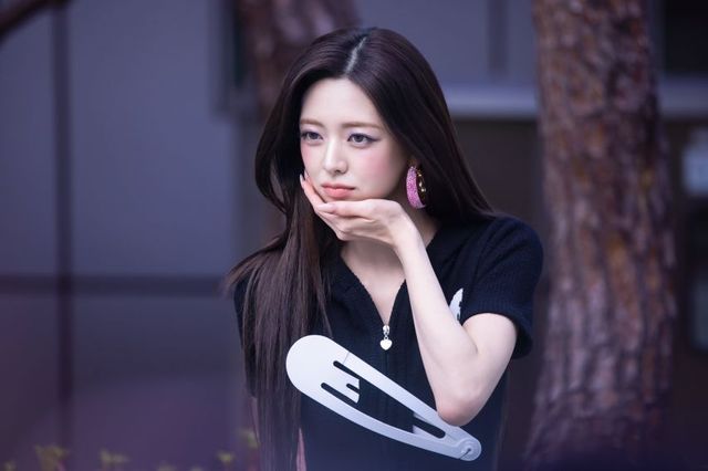 있지(ITZY)의 유나가 은은한 자연광이 비치는 야외를 배경으로, 독특한 화이트 그래픽이 가미된 블랙 니트 탑과 화려한 핑크 글리터 이어링을 매치하여 키치하면서도 고혹적인 아우라를 연출했습니다. 양손을 머리 위로 올려 고양이 귀를 연상시키는 위트 있는 포즈와 카메라를 정면으로 응시하는 매혹적인 눈빛은 그녀 특유의 화려한 비주얼을 정석적으로 부각합니다.