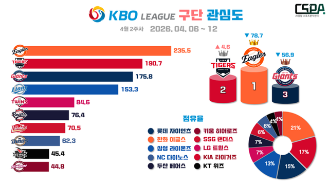 점유율에서는 한화 21%, KIA 17%, 롯데 15%, 삼성 13% 등 총 4개 구단이 두 자릿수를 넘겼다.