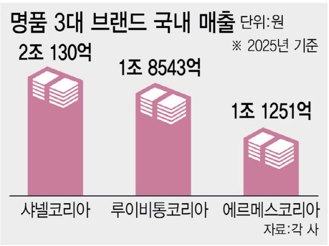 15일 업계에 따르면 에루샤 3사의 지난해 한국 법인 합산 매출은 약 5조원으로 모두 역대 최고치를 경신했다. 에르메스코리아는 처음으로 1조원 벽을 돌파했고, 루이비통코리아는 1조 8000억원대, 샤넬코리아는 2조원을 넘어섰다. 같은 기간 루이비통 본사(LVMH)는 매출이 5% 줄었고, 샤넬 글로벌도 2024년 영업이익이 30% 급감했다. 중국·중동 수요가 꺼지며 성장이 흔들리는 가운데 한국 법인만 독주한 셈이다.