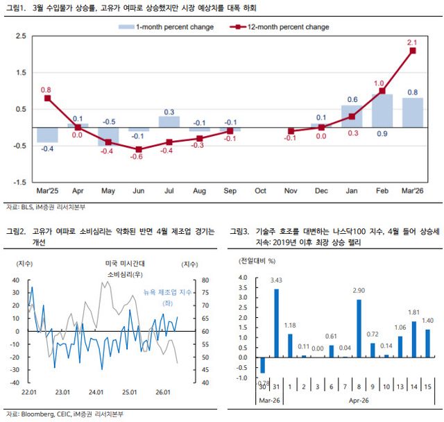 제조업 경기도 예상보다 견조했다. 4월 뉴욕 엠파이어스테이트 제조업지수는 11.0으로 3월의 -0.2와 시장 예상치 0을 모두 웃돌았다. 신규 수주는 6.4에서 19.3으로, 출하는 -6.9에서 20.2로 각각 큰 폭 개선됐다. 다만 전망지수 하락과 가격지수 상승, 주택시장 체감지수인 NAHB 지수 부진 등 일부 부담 요인은 여전히 남아 있다.