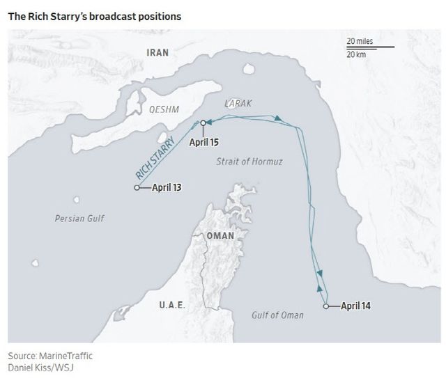 오만만에 진입한 직후 미 해군의 봉쇄 해역 인근에서 갑자기 방향을 바꾼 뒤, 15일에는 이란 연안에 닻을 내렸다.