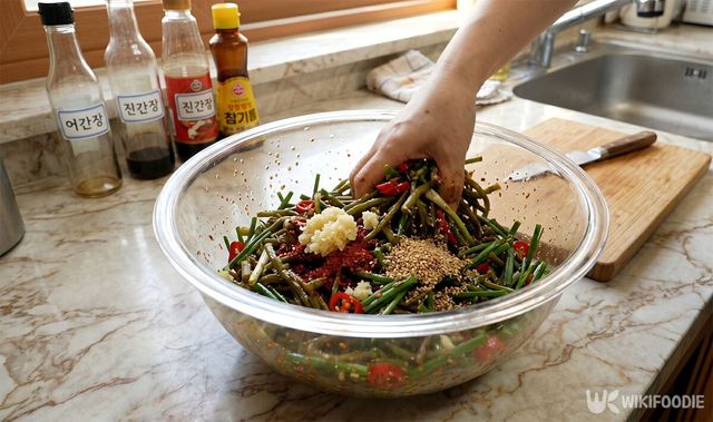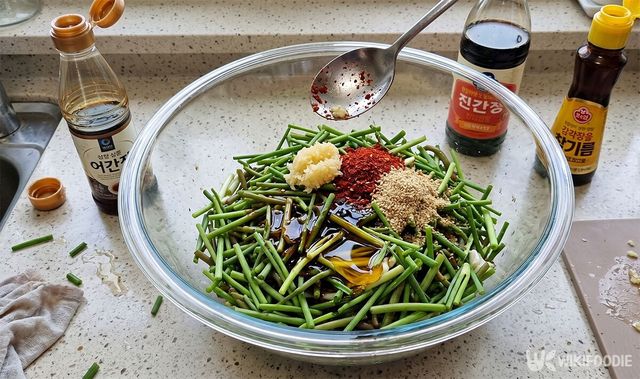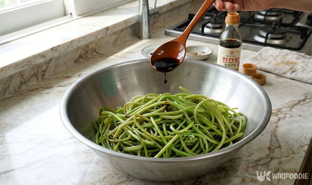 어간장 2큰술과 진간장 1큰술을 먼저 넣어 손으로 조물조물 버무리면, 나중에 잘라서 무칠 때보다 간이 속까지 깊게 배어든다. 또한 이 단계에서 간이 먼저 배면 나중에 줄기가 질겨지는 현상을 막아준다.