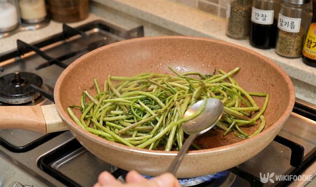 끓는 물에 소금을 약간 넣고 손질한 줄기를 넣는데, 이때 시간 조절이 핵심이다. 줄기를 하나 건져 보았을 때 부드럽게 휘어질 정도면 충분하다. 너무 오래 익히면 흐물거려 아삭한 씹는 맛이 사라지므로 주의해야 한다.