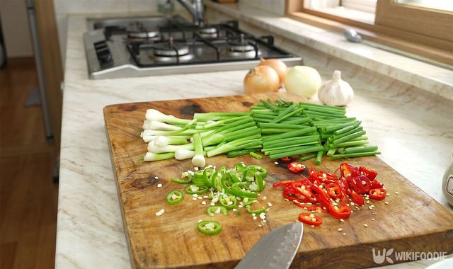 쪽파와 청양고추, 홍고추를 잘게 썬다.