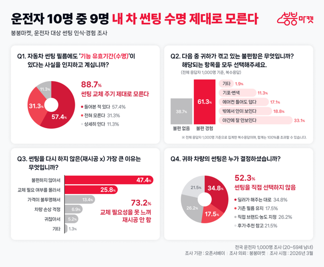썬팅 재시공을 하지 않는 이유로는 필요성을 느끼지 못해서가 47.4%, 정보 부족이 25.8%로 나타났다. 가격이나 시간보다 인식 부족이 주요 원인으로 분석됐다. 제품 성능을 직접 비교하지 않고 딜러 권유나 기존 필름을 유지하는 비중도 52.3%였다.