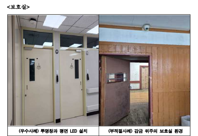 특히 병동의 전체 보호실 10곳 중 4곳(44.6%)은 창문이 없어 외부와 차단된 상태였고 자연 채광과 환기가 어려운 ‘중복도형 구조’도 10곳 중 8곳(83.6%) 이상이었다.