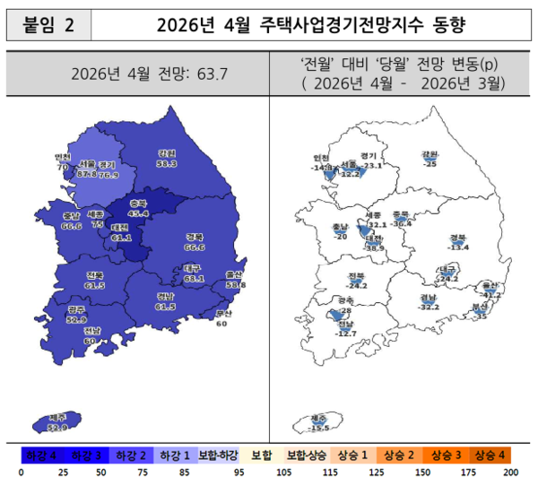 한편, 사업자들의 자금조달·자재수급 여건도 악화돼, 4월 전국 자금조달지수는 전월 대비 16.7 포인트 하락한 66.1, 자재수급지수는 17.0 포인트 내린 79.6으로 조사됐다.