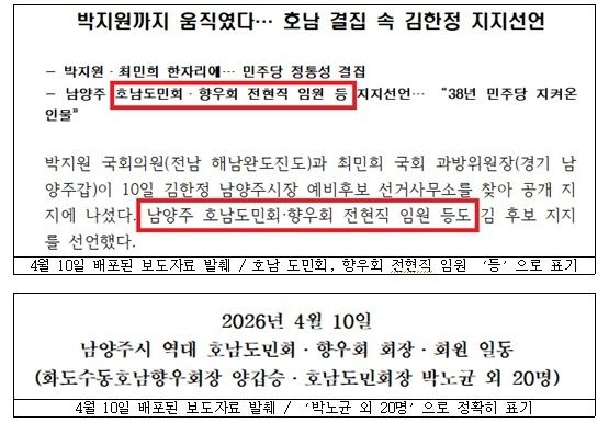 앞서 연합회는 지난 15일 성명서를 통해 “김 예비후보 측이 지난 10일 선거사무소에서 일부 참석자와 촬영한 단체사진을 ‘호남향우회 지지 선언’이라는 이름으로 게시해, 마치 남양주 호남인 전체가 지지하는 것처럼 왜곡했다”고 고발 이유를 밝혔다.