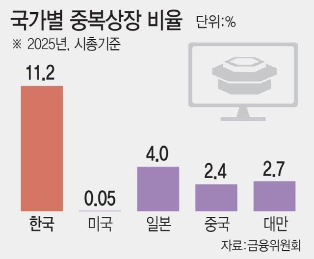 금융위에 따르면 2025년 말 기준 상장사간 지분보유 시가총액 기준 중복상장 비율은 한국이 11.2%로, 미국 0.05%, 일본 4.0%, 중국 2.4%, 대만 2.7% 등 주요국과 비교해 압도적으로 높다.