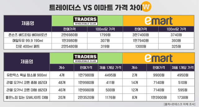 존슨즈 베드타임 베이비로션은 트레이더스에서 100ml당 1799원 수준인 반면 이마트에서는 3740원으로 두 배 이상 높았다. 매일두유(190ml) 역시 트레이더스는 100ml당 307원으로 이마트보다 낮은 가격에 판매됐다. 생필품에서도 유사한 흐름이 확인된다. 유한락스 욕실 청소용 제품은 트레이더스에서 개당 4495원으로 이마트보다 저렴했다.