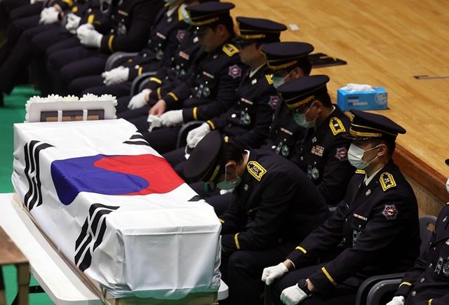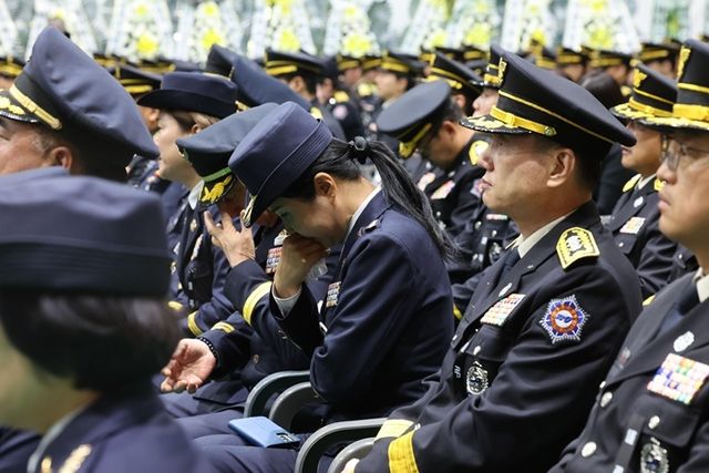 14일 전남 완도군 농어민문화체육센터에서 열린 순직 소방공무원 영결식에서 동료소방관들이 유족들의 추모글 낭독을 듣고 눈물을 흘리고 있다. / 뉴스1