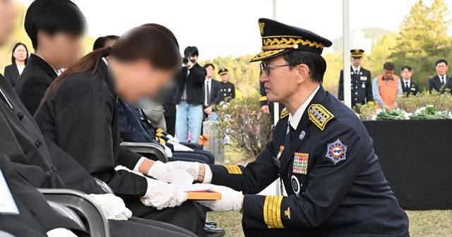 김승룡 소방청장이 14일 오후 대전 유성구 대전현충원에서 열린 故박승원, 故노태영 소방공무원 안장식에 참석해 유족을 위로하고 있다. 두 소방관은 전남 완도군의 수산물 가공업체 냉동창고 화재 현장에서 진압 도중 순직했으며 옥조근정훈장이 추서됐다. / 뉴스1