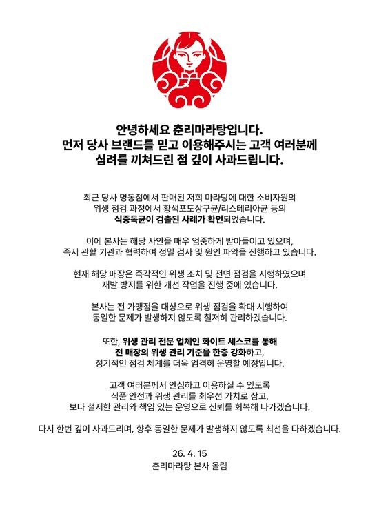 특히 춘리마라탕 본사는 해당 사안을 계기로 즉각적인 대응에 나섰다. 회사 측에 따르면 해당 매장은 즉각적인 위생 조치와 전면 점검을 완료했으며, 현재 관계 기관과 협력해 정밀 검사 및 원인 파악을 진행 중이다.