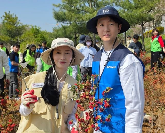 사진 속에는 꽃길 조성 자원봉사에 참여해 직접 꽃을 심으며 의미 있는 시간을 보내는 이정현 부부의 모습이 담겨 있다. 바쁜 일정 속에서도 함께 선한 영향력을 실천하는 부부의 모습이 눈길을 끈다.