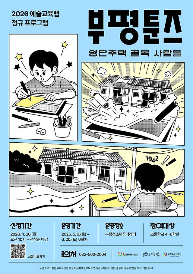 인천 부평구 문화재단은 다음 달 9일부터 6월 20일까지 청소년꿈나래터에서 지역 역사와 웹툰을 결합한 예술교육 프로그램인 '부평툰즈'를 운영한다. 이 프로그램은 지역 특성을 반영한 문화예술교육을 지원하는 '예술교육랩' 사업을 통해 정규 과정으로 편성된 결과물이다.