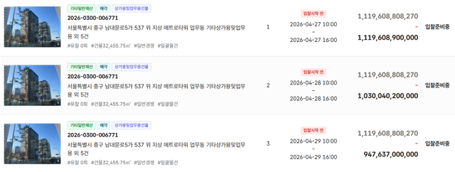 1회차 입찰은 오는 27일(공매가 1조1196억890만원)이며, 만약 낙찰자가 없으면 이튿날인 28일 2회차 입찰(공매가 1조300억4020만원)이 실시된다. 3회차는 오는 29일(공매가 9476억3700만원), 4회차는 30일(공매가 8718억2610만원) 예정돼 있다.