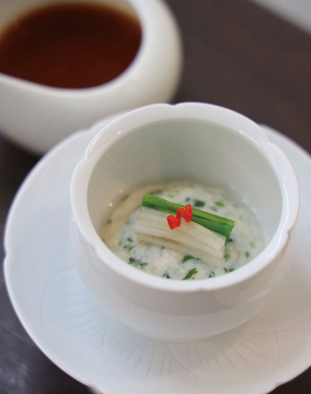 꽃게는 쉬운 재료가 아니다. 열에 민감한 갑각류의 근육 단백질은 조금만 과하게 가열하면 퍽퍽해지고, 내장의 크리미한 질감은 선도에 따라 또 손님의 취향에 따라 호오가 크게 갈린다. 특히 아무리 정성 들여 뼛조각을 발라내도 막상 서브 뒤에 이에 뼛조각이 낀다는 컴플레인을 받는 경우가 많아 파인 다이닝에서는 잘 사용하지 않는다. 그러나 동시에 한국의 꽃게는 세계의 다른 어떤 블루크랩보다도 향이 좋고 단맛이 뛰어난 최상급 단백질이다. 그러니 권숙수의 권우중 셰프처럼 용감한 요리사라면 반드시 다뤄보고 싶었을 것이다. 무엇보다 꽃게의 단백질은 한식을 대표하기 때문이다. 꽃게 한 마리의 살을 다 발라낸 후 두부와 참나물을 섞어 찐 뒤 직접 빻은 고춧가루와 여러 야채를 함께 끓여낸 꽃게 육수를 부어 먹는다.