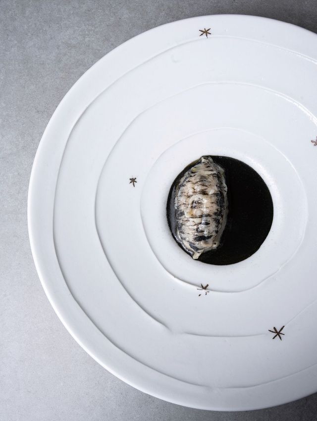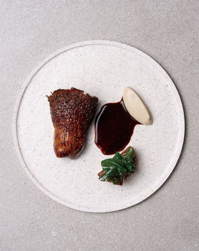 스와니예의 이준 셰프가 제철 식재료와 특산품을 집요하게 추적하고 세심하게 고민해 접시에 올리는 과정은 마치 장인들의 손을 거친 전통 재료로 전시관을 장식하는 현대미술과도 비슷하다. 저온으로 오래도록 조리해 섬유의 방향성을 유지한 채 부드러워진 전복 살에 까치버섯, 대파, 관자 무스를 더하고 이를 만두 안에 소로 채웠다. 그리고 그 밖에는 김과 버터를 이용해 만든 검은 소스를 둘렀다. 전복 껍데기의 모양으로 빚은 만두피에 검은 김 소스가 둘러져 있어 마치 동양화로 그린 전복 같은 모양새. 부드러우면서 탄력 있는 만두피의 질감과 전복의 쫄깃한 식감, 까치버섯 특유의 꼬들꼬들한 식감이 한 입에 터져 나오며 김이 가진 바다의 진한 맛과 만난다.