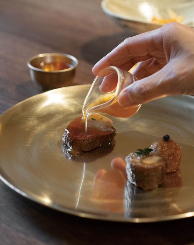 간장 소스를 발라 숯불에 구운 한우 안심 위에 우족 테린을 올린다. 우족 위에 후추 향 가득한 맑은 비프 주(jus)를 부으면 안 그래도 부드러운 안심 위에 실키한 젤라틴이 흘러내린다. 전복과 한돈으로 만든 소를 불고기 양념한 한우 등심으로 감싸 한우 순대를 만들어 옆에 올린다. 산초장아찌와 부드럽게 익혀낸 마를 쌀가루에 묻혀 바삭하게 튀겨내어 고기와 곁들인다. 한국 유일의 미쉐린 가이드 3스타 레스토랑인 강민구 셰프의 밍글스가 한우와 한돈으로 만든 이 접시 위에는 대한민국에서 구할 수 있는 가장 호사스러운 단백질들이 다양하게 어우러져 있다. 특히 우족 젤라틴을 올린 한우 안심은 혀로 녹여 먹을 수 있을 정도로 부드러워 내 혀의 감각을 의심하게 만들 정도다.