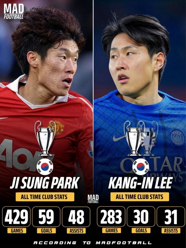 박지성은 클럽 통산 429경기 59골 48도움을 기록했으며, 이강인은 현재까지 283경기 30골 31도움을 기록 중이다.