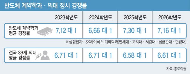 16일 종로학원에 따르면 삼성전자·SK하이닉스의 반도체 계약학과는 2026학년도 정시에서 82명 모집에 587명이 지원해 평균 경쟁률 7.16대 1을 올렸다.