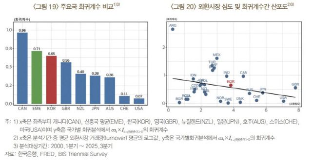 한은의 분석 결과, 자본 유출 시 원화의 환율 반응 계수(0.65)는 일본(0.38)·미국(0.07)·호주(0.36)·스위스(0.11) 등 주요 선진국보다 훨씬 높았다. 외환시장 거래량이 적어 같은 충격에 원화가 더 크게 흔들린다는 의미다.