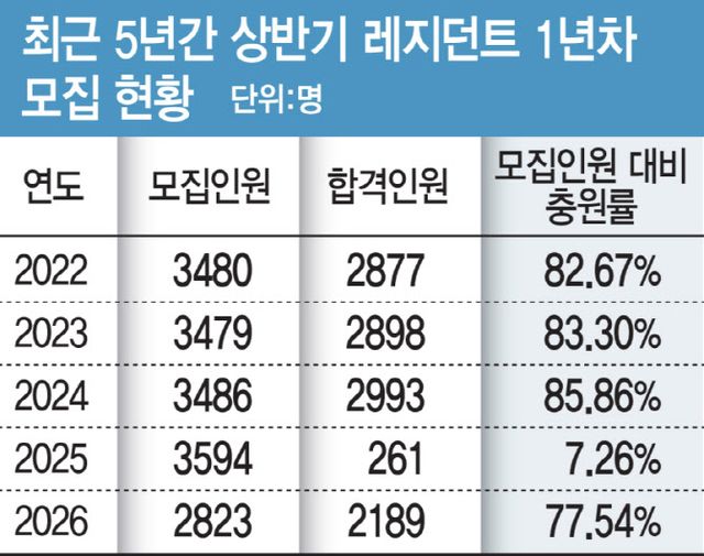 정부는 올해 상반기 레지던트 1년차 모집인원을 전년 대비 78.54%에 불과한 2823명을 모집하기로 했지만 합격자는 모집인원 4명 중 3명만을 채우는 수준인 2189명에 그쳤다.