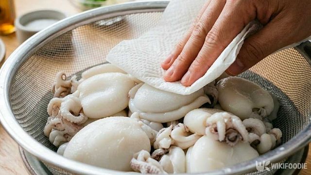 2. 데친 갑오징어를 건져 체에 올려 물기를 제거한다.
