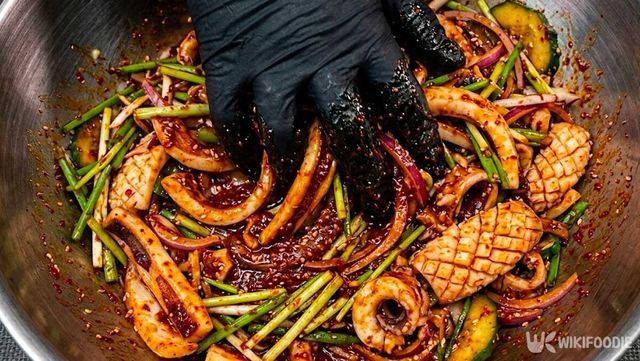 → 갑오징어 500g, 양파 85g, 대파 50g, 청양고추 18g, 다진마늘 1큰술, 고추장 2큰술, 진간장 2큰술, 식초 3큰술, 알룰로스 3큰술, 고춧가루 3큰술, 깨 1큰술