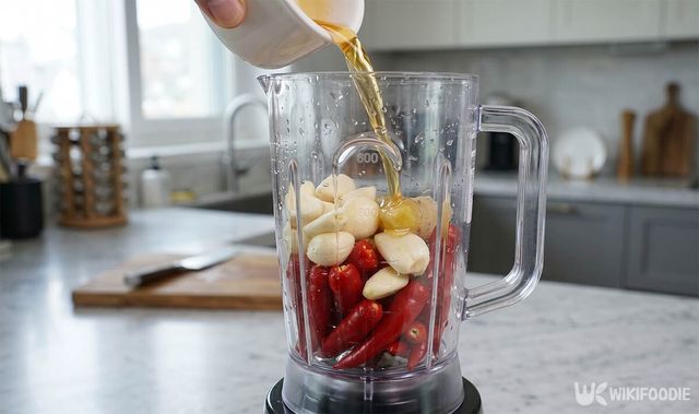 홍고추 8개, 통마늘 10톨, 생강 1톨에 물을 약간 넣고 곱게 간다.