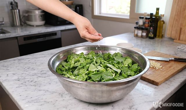 물기 있는 상태에서 천일염 30g을 뿌려 30분 절이고 중간에 한 번 뒤집는다.