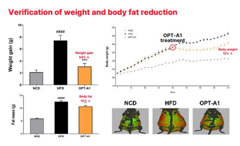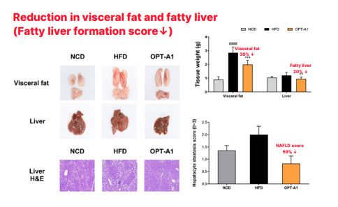 전임상 자료도 주목된다. 회사 자료에 따르면, 고지방식 기반 비만·비알코올성 지방간(NAFLD) 동물모델에서 메타바이오틱스 투여군은 체중 증가율 12% 감소, 총 체지방 15% 감소, 내장지방 30% 감소, 지방간 20% 감소, NAFLD Score 59% 감소를 보였다.
