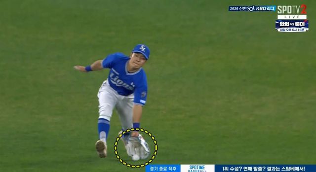 그런데 TV 중계 화면은 다른 장면을 보여줬다. 공이 그라운드에 한 차례 바운드된 뒤 김지찬의 글러브로 들어간 것이 육안으로도 확인됐다. 중계진도 "비디오 판독은 가지 않네요"라며 의외라는 반응을 드러냈다. 채은성 역시 더그아웃 쪽을 바라보며 비디오 판독 요청 의사를 전달하는 듯한 제스처를 취했다.