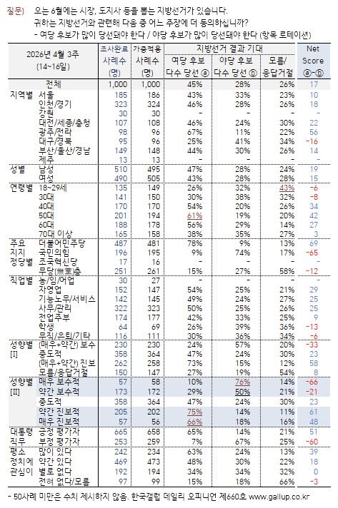 성향별로는 진보층의 73%가 여당을, 보수층의 57%는 야당의 승리를 기대했다. 중도층에서는 야당 승리를 기대한다는 응답이 24%로, 여당 47%보다 23%p 낮아 여론이 일부 기운 것으로 나타났다. 26%는 의견을 유보했다.