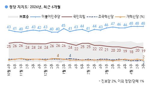 조국혁신당과 개혁신당은 각각 2%를 기록했으며, 지지하는 정당이 없다는 무당층은 26%였다.