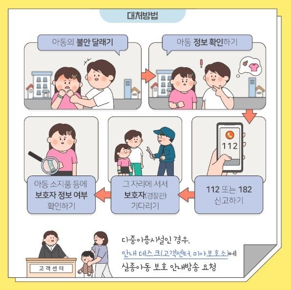 • 현장 대기: 보호자가 근처에서 아이를 찾고 있을 수 있으므로, 경찰이 올 때까지 아이와 함께 그 자리를 지켜야 한다.