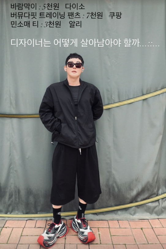 황재근은 16일 자신의 SNS에 “바람막이 5천원 X이소, 버뮤다핏 트레이닝 팬츠 7천원 X팡, 민소매 티 3천원 X리”라는 글과 함께 사진 한 장을 게시했다.