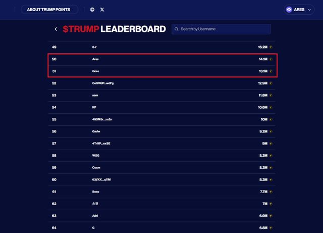 오피셜 트럼프 측이 운영하는 공식 리더보드에 따르면 주현서 대표는 14.1M으로 50위, 고로 림 공동창업자는 13.0M으로 51위에 올라 있다. 이는 공개적으로 확인 가능한 한국인 참가자 중 최상위권 기록이다.