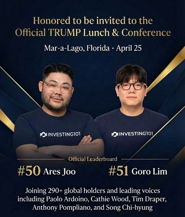 오는 4월 25일 미국 플로리다 마러라고 리조트에서 열리는 도널드 트럼프 미국 대통령의 밈코인 ‘오피셜 트럼프($TRUMP)’ 상위 보유자 대상 런치 & 콘퍼런스에 한국 스타트업 창업자 2명이 초청된 것으로 알려졌다.