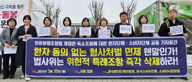 한국환자단체연합회와 한국소비자연맹, 소비자시민모임은 “고위험 필수의료행위의 범위와 의료사고 형사처벌 특례는 의료사고 피해 환자와 유가족의 권리에 중대한 영향을 미치는 사안임에도 이번 개정안이 사회적 논의와 공론화 과정을 거치지 않았다는 점을 매우 심각하게 보고 있다”고 주장했다.