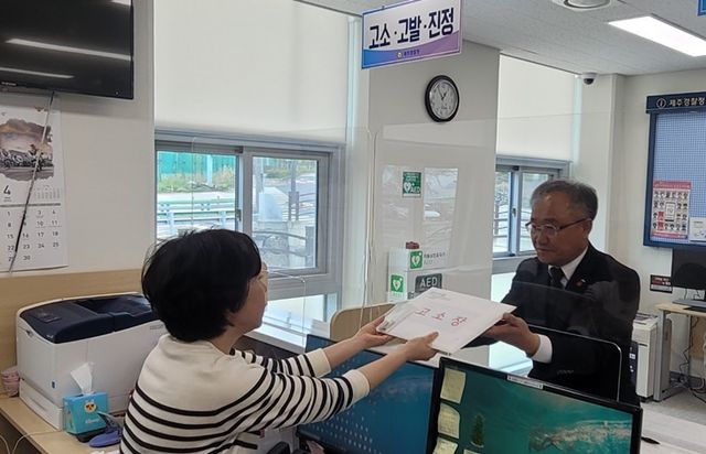 17일 제주경찰청에서 김창범 제주4·3희생자유족회장이 4·3 왜곡 집회와 관련해 고소장을 제출하고 있다. 박소정기자