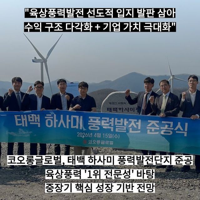 이번 준공은 하사미 풍력발전단지 '민간 V.PPA(가상전력구매계약)' 성과와 맞물려 코오롱글로벌 재생에너지 사업 역량이 운영·서비스 영역까지 완성됐음을 나타내는 이정표로 의미가 크다.